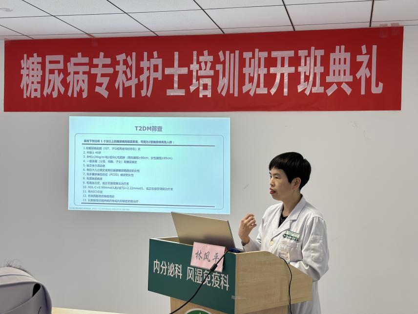 开班仪式结束后,内分泌科林凤平主任进行题为《国家基层糖尿病防治管理指南(2022版)》的精彩授课,详细全面的从糖尿病的诊断、分型、监测、筛查、治疗等多方面进行讲解,并从护士的角度切入指导如何进行糖尿病科学防治和健康管理,让学员们受益匪浅。