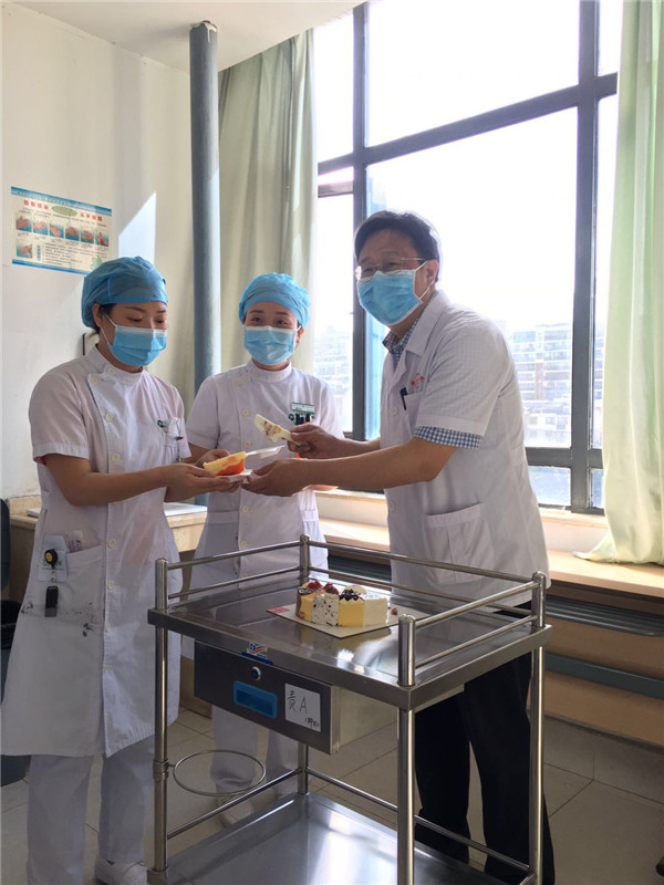 欢乐是可以传递的,为杨叔叔庆生的言语交谈间,病房的病友及家属得知今天是护士姐妹们的节日,活泼俏皮的阿姨自发地“献歌献舞”祝全科护士姐妹节日快乐,咸宁绿地集团帅哥代表为每位白衣天使送来了鲜花与祝福。让大家备受鼓舞的是,舒诚荣主任亲手为大家切分蛋糕,肯定和感谢大家的工作与付出,为每位护士姐妹给予了节日祝福和语重心长的工作寄语,大家纷纷感受到“家”的温暖。